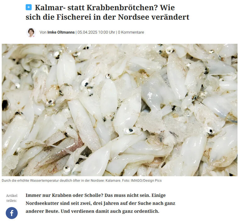 und im Januar und Februar haben Kutter aus Neuharlingersiel Ostfriesland den bis zu 50cm großen Gemeinen Kalmar (Loligo vulgaris Lamarck, 1798) an der niederländischen Küste und vor Belgien gefangen. 2023 waren es 100 Tonnen und 2024 bereits 200 Tonnen. Sicher ist es eine Auswirkung des Klimawandels, dass sich die Art im Frühjahr auch in der Nordsee immer mehr ausbreitet – durch Migration und Fortpflanzung in immer wärmer werdenden Gewässern.