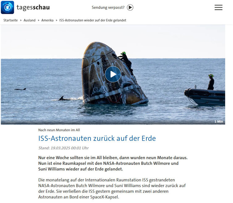 Mittwoch 19. März 2025 Tagesschau und dpa: Delphine begrüßen rückkehrende Astronauten