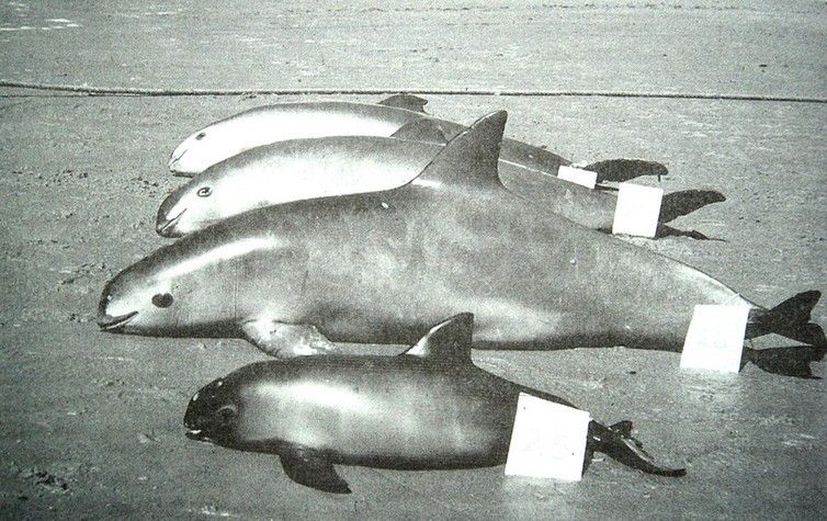 Vier Vaquitas als ungewollter Beifang der Stellnetz – Fischerei im Vordergrund ein Jungtier ( Photo A. Robles) . Aus D‘ Argosa et al. 1995 in BIOLOGY OF THE PHOCOENIDS S 282