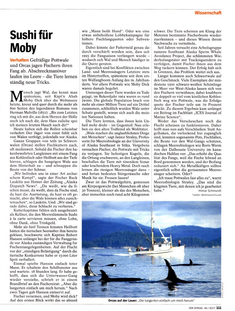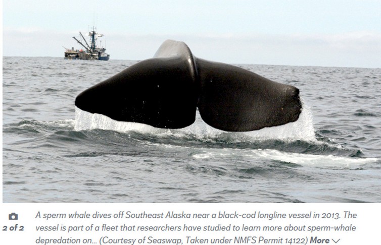 Erstmalig hätten japanische Fischer in den 50er Jahren des vergangenen Jahrhunderts über räuberische Orcas berichtet. Im westlichen Teil des Golfs von Alaska bis zu den Aleuten wurden 1475 Schwertwale gezählt, aber in der Bering See am Kontinentalschelf sei die Dichte größer dort, wo sich die Fischgründe für Heilbutt und den schwarzen Dorsch überlappten. Die sozial lebenden Schwertwale hätten gelernt, den vielversprechenden Geräuschen der Hydraulik und Motoren fischender Boote zu folgen, könnten einzelne Fahrzeuge unterscheiden und würden ihr Wissen an die Nachkommen weitergeben. Ein ähnliches Problem gibt es seit 2006 mit Pottwalen und der Langleinenfischerei auf den schwarzen Dorsch Anoplopoma fimbria (Pallas, 1814). Selbst das Abspielen von dröhnender Heavy Metal Musik unter Wasser sei nicht in der Lage die Pottwale zu vertreiben, auf Täuschungsversuche mit Phantom – Bojen fielen sie nicht herein.