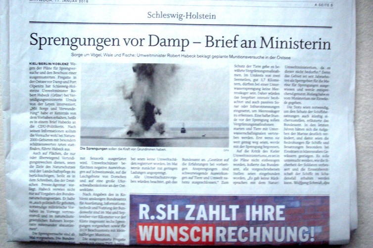 In der Zwischenzeit gibt es keinen vernünftigen Zweifel mehr an der Tatsache, dass Schweinswale regelmäßig vor den Küsten Schleswig Holsteins in den FFH Gebieten aber auch im benachbarten Sperrgebiet vorkommen. Obwohl während eines Workshop des OIC Eckernförde im Januar 2016 den Vertretern der Bundeswehr und der WTD 71 in mehreren wissenschaftlichen Vorträgen dargelegt wurde, wie häufig und wie schwer das Gehör der Schweinswale selbst bei kleineren Sprengungen geschädigt werden kann, setzen sich Bundeswehr und WTD 71 offensichtlich unbeeindruckt darüber hinweg und planen Sprengungen mit ungeeigneten Vergrämungsmaßnahmen.