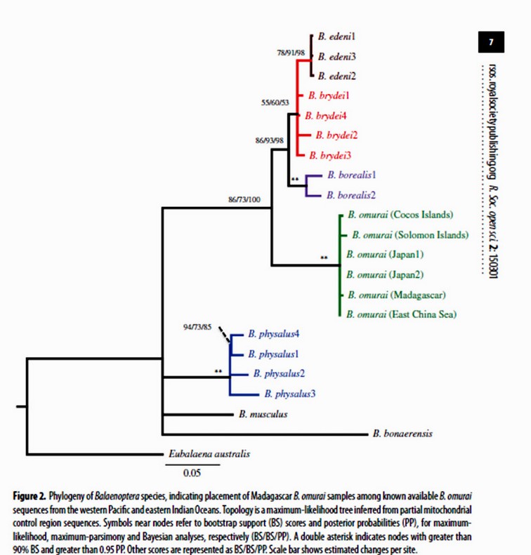 Die etwas vereinfachte Darstellung des Spiegelartikels bedarf vielleicht einer kurzen, weiteren Erläuterung. Nach der Beschreibung des Eden-Wals (Balaenoptera edeni ) 1879 durch Anderson und des Bryde-Wals ( Balaenoptera brydei ) 1913 durch Olson hielt man beide lange Zeit für dieselbe Art. Erst 1961 konnte auf Grund morphologische Unterschiede der Schädel nachweisen, dass es sich zwar um eng verwandte, aber doch unterschiedlichee Arten handelt.