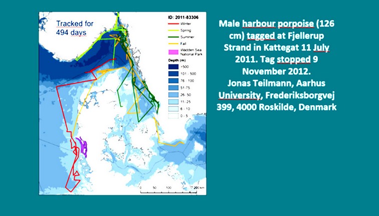 Die Bedingungen zum Überleben für Schweinswale mögen in der Nordsee und insbesondere in den Gezeiten geprägten Watten andrere sein als in der Ostsee, der Grad der Bedrohung durch menschliche Aktivitäten wie den unbeabsichtigten Beifang in Grundstellnetzen, wie die Anreicherung von immer neuen Umweltgiften in Organen und Blubber, wie den zunehmenden Schiffsverkehr, die industrielle Nutzung, wie die Überfischung, die Verlärmung, wie den herumtreibenden Plastikmüll usw. erreicht aber gleiche Größenordnungen. Hierzu vermittelte insbesondere der Vortrag von Prof. Prof. hc. Dr. Ursula Siebert (Institut für Terrestrische und Aquatische Wildtierforschung Profil&Struktur Die Stiftung Tierärztliche Hochschule Hannover TiHo)interessante Erkenntnisse aus veterinär-pathologischer Sicht. Prof. Dr. Jonas Teilmann von der Universität Aarhus konnte anhand der Routen besenderter Schweinswale zeigen, dass nur ein Teil das Wattenmeer intensiv bnutzt, während sich andere eher außerhalb aufhalten. Besonder interessant war die Auswertung der Route eines 126cm großen, besenderten, männlichen Schweinswals zwischen dem 11. Juli 2011 und dem 9. November 2012: Der Schweinswal schwamm vom Kattegat über das Skagerak bis zur Elbmündung in der Nordsee und dann den gleichen Weg zurück. Der Kontakt endete nach 488 Tagen in der zentralen Ostsee an der Südostspitze von Schonen.