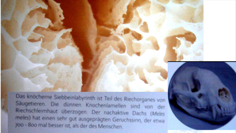 Das Titelblatt des ITAW -Kalenders zeigt die Siebeinzellen Cellulae ethmoidales eines europäischen Dachses (Meles meles, Linnaeus 1758). Anatomisch liegen sie innenseitig von den knöchernen Augenhöhlen den Orbitae, von denen sie nur durch dünne Knochenlamellen (Laminae papyraceae) getrennt sind.