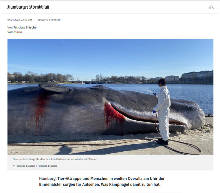 hamburg.t-online: „Hinter der ungewöhnlichen Installation steckt das belgisch-niederländische Künstlerkollektiv Captain Boomer Collective aus Antwerpen. Die Gruppe ist bekannt für interaktive Kunstaktionen im öffentlichen Raum – ihre lebensgroße Pottwal-Skulptur ist bereits in mehreren Städten "gestrandet".“