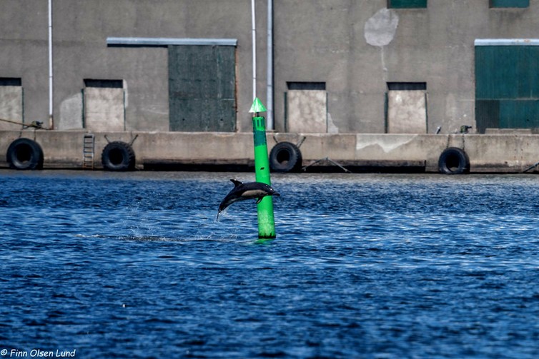 Am Samstag wird ein Allg. Delphin Delphinus delphis an der Steuerbordtonne im Limfjord NordJyske von Daniel Løth Nielsen fotografiert, der sein Foto auf der Facebookseite Hvaler.dk - Hval og sæl observationer i Danmark postet.