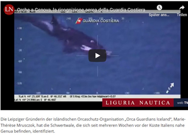 Wie www.cetacea.de auf ihrer Seite am 22. Dezember 2019 mittteilt, wurden 4 Mitglieder einer isländische Schwertwalfamilie Anfang Dezember erstmals im Hafen von Genua beobachtet und von einer Drohne der Küstenwache gefilmt. Marie-Thérèse Mrusczok, die vor 6 Jahren die Organisation Orca Guardians Iceland gegründet hat, konnte einzelne Mitglieder der Gruppe identifizieren, die mit 5 200 km Luftlinie von den westisländischen Snaefellsnes-Halbinsel bis dahin einen „Migrationsrekord“ für ihre Art aufgestellt hat, darunter befand sich auch „Riptide SN 113“ . Auf dem von www.cetacea.de veröffentlichten Video ist zu erkennen, wie ein weiblicher Schwertwal einen kleinen, toten Schwertwal im Maul hält. In einem zeitlich früheren Videoclip der GUARDIA COSTERIA – 06. 12. 2019 - ist zu sehen, wie sich der kleine wohl erst kürzlich geborene Schwertwal neben seiner Mutter durch die aufgewühlte See des Hafenbeckens kämpft (etwa Beaufort 6 bis 7 ablandig).