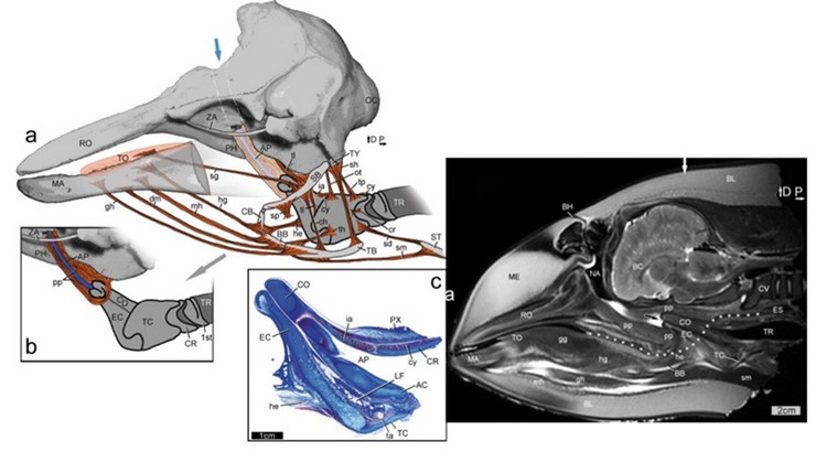 Anatomie des Larynx bei einem Schweinswal, schematische Darstellung und MRT. Die gepunktete Linie zeigt den Weg eines geschluckten Fisches auf beiden Seiten am Larynx vorbei in die Speiseröhre Aus Huggenberger et al. 2008.