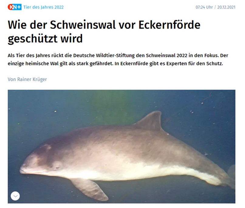 Die Kieler Nachrichten berichten, dass die Wildtier-.Stiftung den Schweinswal zum Tier des Jahres 2022 gewählt hat. Zentriert am OIC in Eckernförde gibt es seit 2013 das Programm der schweinswalfreundlichen Bucht Eckernförde mit einer freiwilligen Vereinbarung, die ein großer Teil der Fischereibetriebe zwischen Flensburg und Travemünde unterschrieben haben, zum Schutz der Scheinwale und tauchenden Meeresenten.