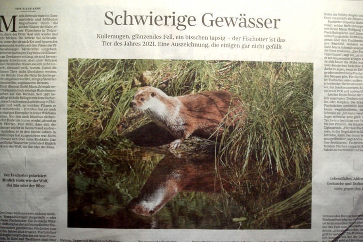 Sein Vorgänger ist der Fischotter als Tier des Jahres 2021, Die Süddeutsche Zeitung beschäftigt sich durchaus kritisch mit der Auszeichnung für Lutra lutra (Linnaeus, 1758) als Tier des Jahres 2021was insbesondere Teichwirten und Anglern nicht gefällt. Ähnlich wie bei Wolf und Bär ist die die Sicht auf den „Wassermarder“ zwiespältig, Früher als Fischräuber oder auch als Pelzlieferant gnadenlos verfolgt, listet das BfN den Fischotter in Deutschland heute unter Gefährdungsstufe 1 als „vom Aussterben bedroht ein (Wikipedia) Heute wird er in einige Ländern wieder nachgewiesen, mit neuen Gefährdungen durch den Verkehr und Umweltgiften. Angeblich soll er die Existenz mancher Fischereibetriebe gefährden, da er weder mit Lärm, Lebendfallen, oder Duftstoffen von Zuchteichen ferngehalten werden kann und den Fischbestand in freier Wildbahn und in den Zuchtbetrieben gefährdet. Offensichtlich ist er für die Fischereibetriebe an Nord- und Ostsee noch kein Problem. Obwohl TARKA der Otter im Land der zwei Flüsse, wie es Henry Williamson es 1927 beschreibt, auch an der Küste gejagt und gelebt hat, wird er bisher im Gegensatz zum Schweinswal noch nicht zu den „Fressfeinden“ gezählt (s. auch 29. Oktober 2021 diese Chronik).