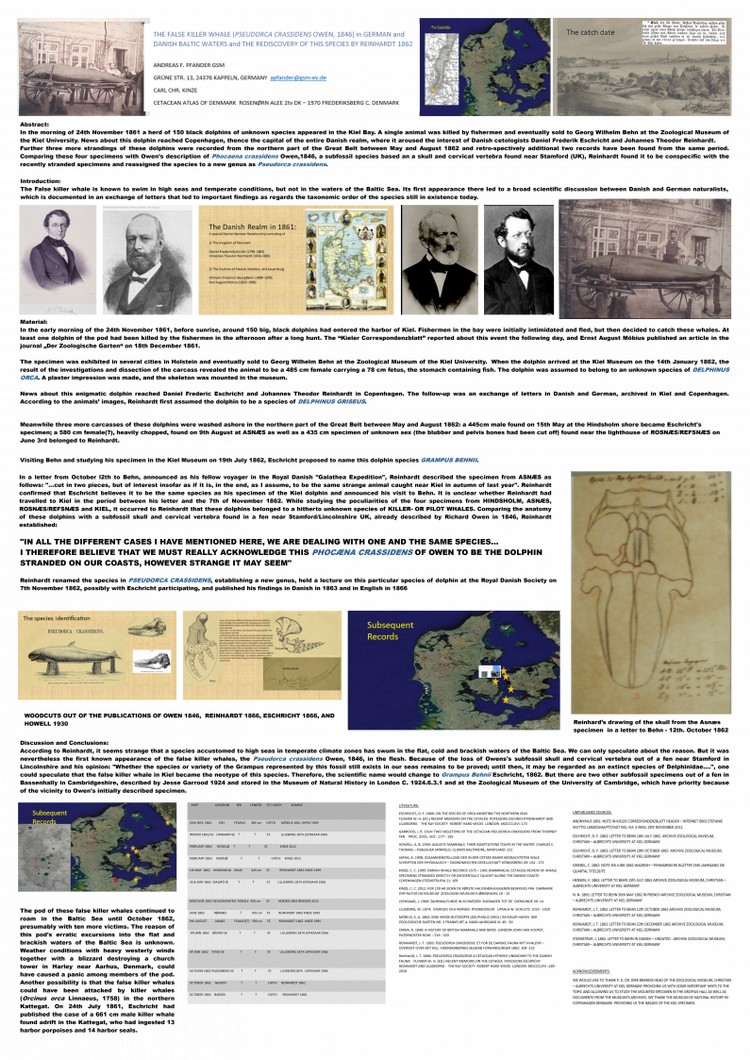 Nach Verbesserungen konnte das Poster jetzt in die virtuelle Galerie der Konferenz hochgeladen werden. Das Poster beschäftigt sich mit dem ersten Lebendnachweis des Kleinen Schwertwals in der Ostsee vor 161 Jahren, von dem man bis dahin annahm, er sei ausgestorben. Das eine Art, die sonst nur hochozeanisch, in temperierten Gewässern vorkommt, für 1 Jahr in der Ostsee herumirrt und bei den dänischen und deutschen Wissenschaftlern für Verwirrung sorgt, bis Johannes Theodor Reinhardt in einer überraschenden Wendung die Art identifiziert und in Pseudorca crassidens (Owen, 1846) umbenennt, gehört zu den Merkwürdigkeiten der Wissenschaftsgeschichte. Co- Autor ist der bekannte dänische Wissenschaftler Dr. Carl Christian Kinze aus Kopenhagen DK. Vielen Dank an Sybille Westphal und Hans-Joachim Lüdcke für die Hilfe bei der Übersetzung ins Englische, sowie der elektronischen Aufarbeitung!