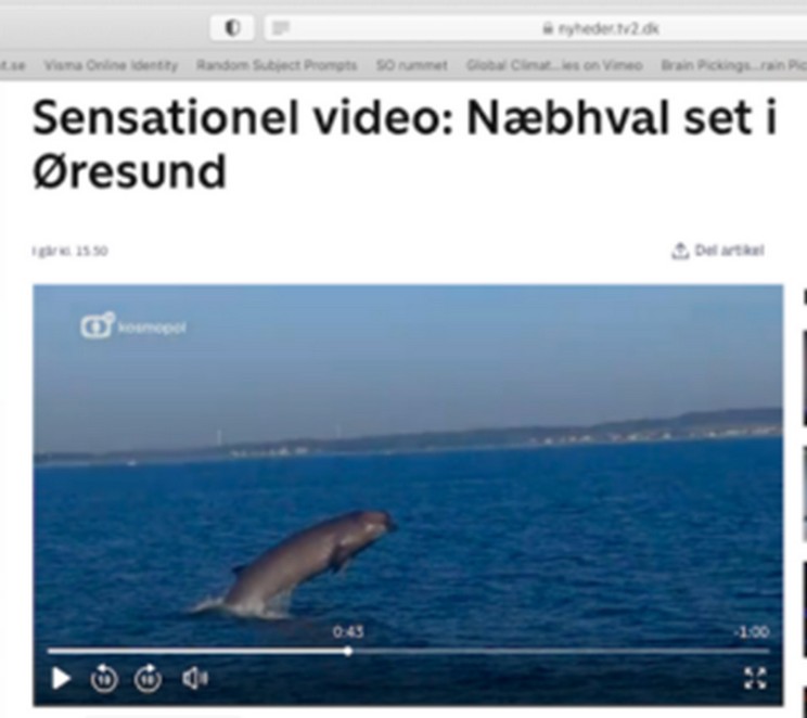 Aus dem Schwedischen übersetzt: „Am Sonntag, den 10. September, wurde im nördlichen Teil des Sunds ein Nördlicher Schnabelwal (Tau) beobachtet. Das dänische Fernsehen 2 hat einen Kurzfilm veröffentlicht, der zeigt, wie der Wal mit seiner Schwanzflosse zuschlägt und auch spektakulär springt (fast sein ganzer Körper über der Oberfläche).“