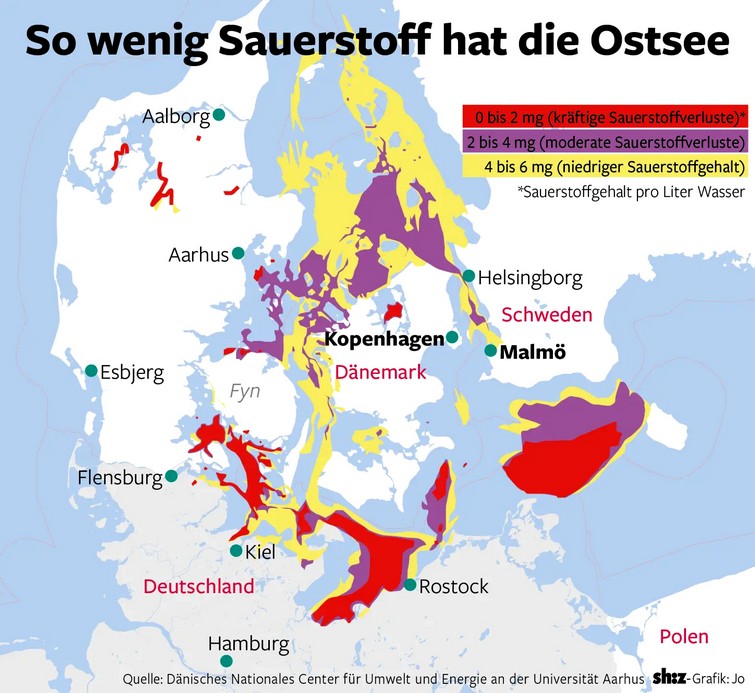 Das Dänische Nationale Center für Umwelt und Energie veröffentlicht eine Karte mit dem Sauerstoffgehalt pro 1 000ml Ostseewasser in verschiedenen Regionen aus shz 06.10.2023 Seite 4
