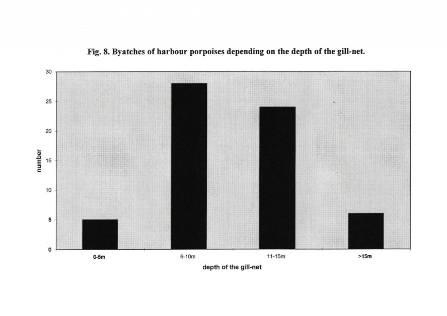 The majority of the approximately 75 % of the harbour porpoises incidentally caught during fishing operations were juveniles. This has also been reported by other authors with one possible reason that young animals often swim into the nets while older animals have gained enough experience to know how to avoid getting entangled (Smith et al 1983, Kinze 1990, 1994, Benke et al 1991, Berggren 1994, Gearin et al 1994). There are 3 reasons for this also mentioned in the literature (Kastelein et al. 1995), at first young harbour porpoises start to explore the environment, which is dangerous when these animals encounter fishing nets. Secondly it also seems plausible, that young unexperienced animals do not react echos, which they should perceive as threats. 3. Young animals are usually less cautious and have less precise control over their body movements and, therefore swimming mistakes may occur. This may contribute to a large degree to the entanglement of young harbour porpoises even when they are aware of the danger, the net poses (Dawson 1994, Kastelein 1995). It may be also a question of distance estimation and control of swimming speed, which porpoises gain with experience. For example net experiments performed in a pool with two subadult and unexperienced harbour porpoises showed that the animals, after their first entanglement, learned in the following sessions to avoid this and regarded the nets as a threat (Kastelein 1995).