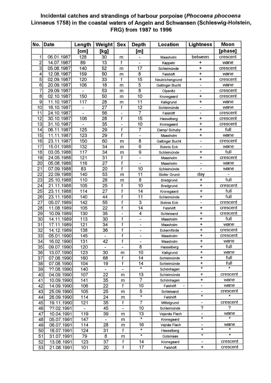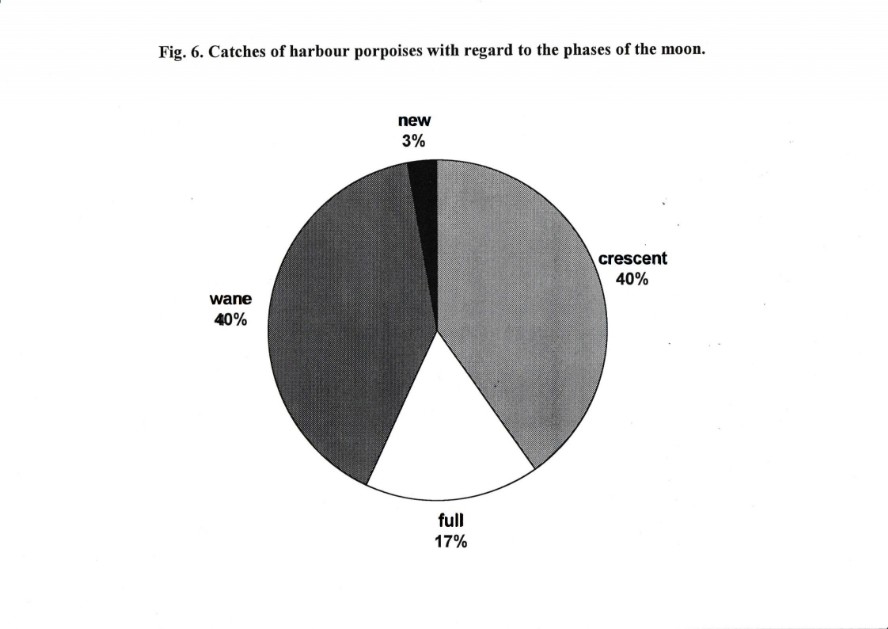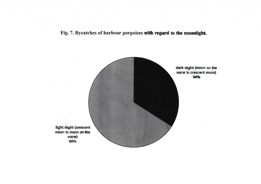However, the depth of water is limited in the Baltic Sea, especially in the coastal region of the research area. In contrast to our investigation Read et al. (1990,1997) and Tregenza (1994, 1997) had published data, which show that the accidental capture of harbour porpoises can occur in bottom set gill nets in a depth up to 200 m, but anatomy and physiology of harbour porpoise eyes would allow for optical orientation, as well as hunting and feeding up to this depth of water (Kröger & Schulze1996). Up to now there exists no published data of other areas where harbour porpoises and other small cetaceans are captured in bottom set gill nets in relation to moon phases. An explanation for the fact, that there is more by-catch of harbour porpoises on moonlit than on other nights, could be explained by an increasing effort of the fishery in this phase of moon. But our knowledge, based on interviews with fishermen allows for the statement, that fishing activities depend on weather conditions, depletion of quota and the condition of market and prices more than on moon phases, which has also been suggested by Savage & Hardy (1934).