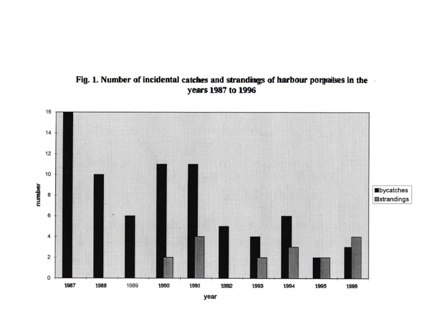 The number of by-catch varied from year to year but has clearly diminished during the period of research (Fig. 2). The highest number of by-catch was documented for 1987 with 16 harbour porpoises, and the lowest in 1995 with two (Fig. 2). The number of harbour porpoises, washed ashore annually appeared to range from two to four, except for 1996, when the number of strandings was even higher than the number of by-catch (Fig. 2).