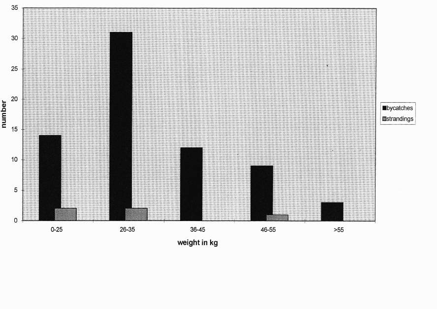 On the other hand the distribution of stranded animals classified into 2 categories in length and weight (Fig. 4 and 5) seems to mirror the true conditions of age distributions of the stock. Also, the registered cases of harbour porpoises washed ashore will suddenly be in the majority of by-catch, which had been discarded. The clearest indication for this are the typical skin lesions (netmarks) found more or less on the animals as well as a temporal and local distribution of the strandings. Siebert et al (1994) considered netmarks to be the only characteristic of by-catch. Such lesions were found in all carcasses sent in by fishermen and were used to identify stranded animals as suspects of by-catch. However, in stranded animals these lesions cannot always be found, because the carcasses are often too decomposed (Siebert et al 1994). This was the case in 8 carcasses out of 17 strandings in our research; all of the others showed typical skin lesions caused by nets and therefore can be suspected by-catch.