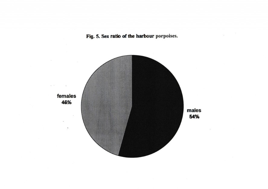 In order to be consistent with the information presented previously by Kock & Benke (1996) the animals were split into five weight categories and four size categories. This division showed, that most of the sampled animals were of a weight less than 35 kg and a length less than 135 cm (Fig. 4 and 5), which implies, that mainly sub-adults swim into the nets. Considering the sex ratio there ist a slight predominance (54%) of males when compared with females (Fig. 6); however, this is not statistically significant.
